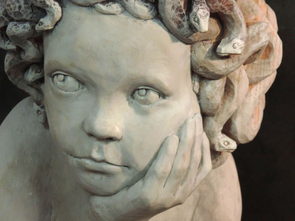 Second work with a mythological theme, a young medusa in the act of writing a letter. The attitude of participation and suspension indicates that it is an important letter, heartfelt, perhaps a love letter? In any case, a moment of humanity, of life and a still possible future, before the weight of the myth collapses on her